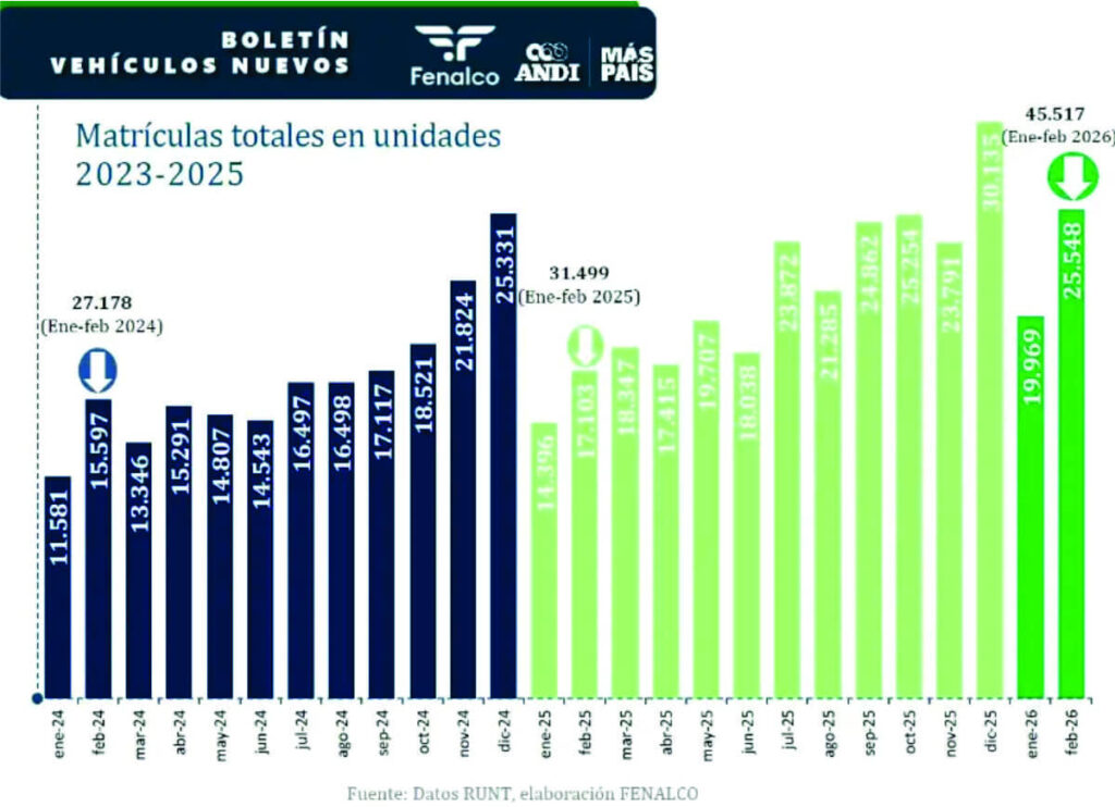 De acuerdo con el Informe de Registro de Vehículos a febrero de 2026 presentado por Fenalco y Andi, en el segundo mes del año se matricularon 25.548 vehículos nuevos en Colombia, lo que representó un crecimiento del 49,4% frente a febrero de 2025, cuando se contabilizaron 17.103 unidades.