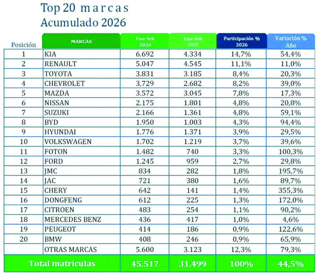En el acumulado enero-febrero, el liderazgo también lo mantiene Kia con 6.692 unidades (14,7% de participación y crecimiento de 54,4%), seguida por Renault, Toyota, Chevrolet y Mazda, que en conjunto concentran el 50,2% del mercado en lo corrido de este año 2026.